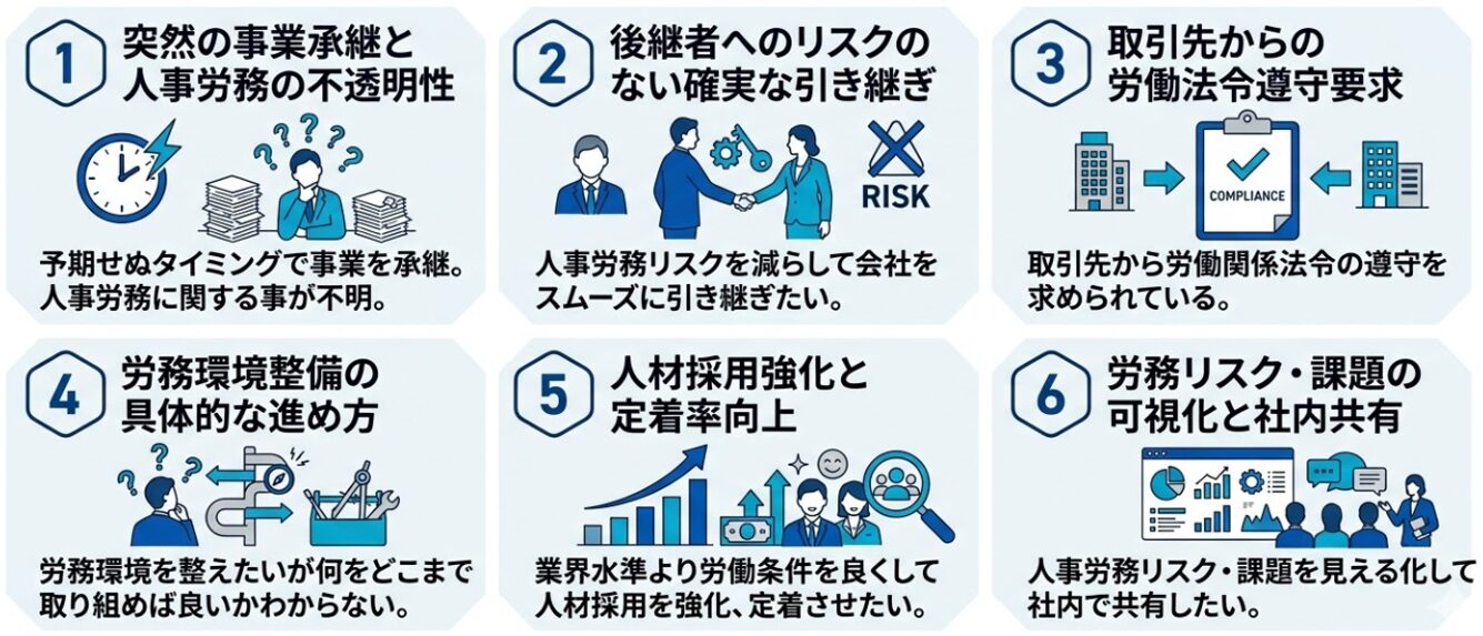 複数の社労士で労務診断を実施、ツールを使用して取引先が懸念する80項目(雇用契約、労使協定、就業規則、安全衛生、労働社会保険、ワークライフバランス等)をチェック、従業員ヒヤリングや現地調査を経てレポートを作成、改善案を提示